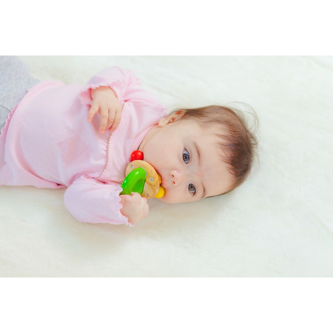 The Bell Rattle comes with an easy grasp handle and colorful rattle beads to help stimulate babies to explore their auditory skill.