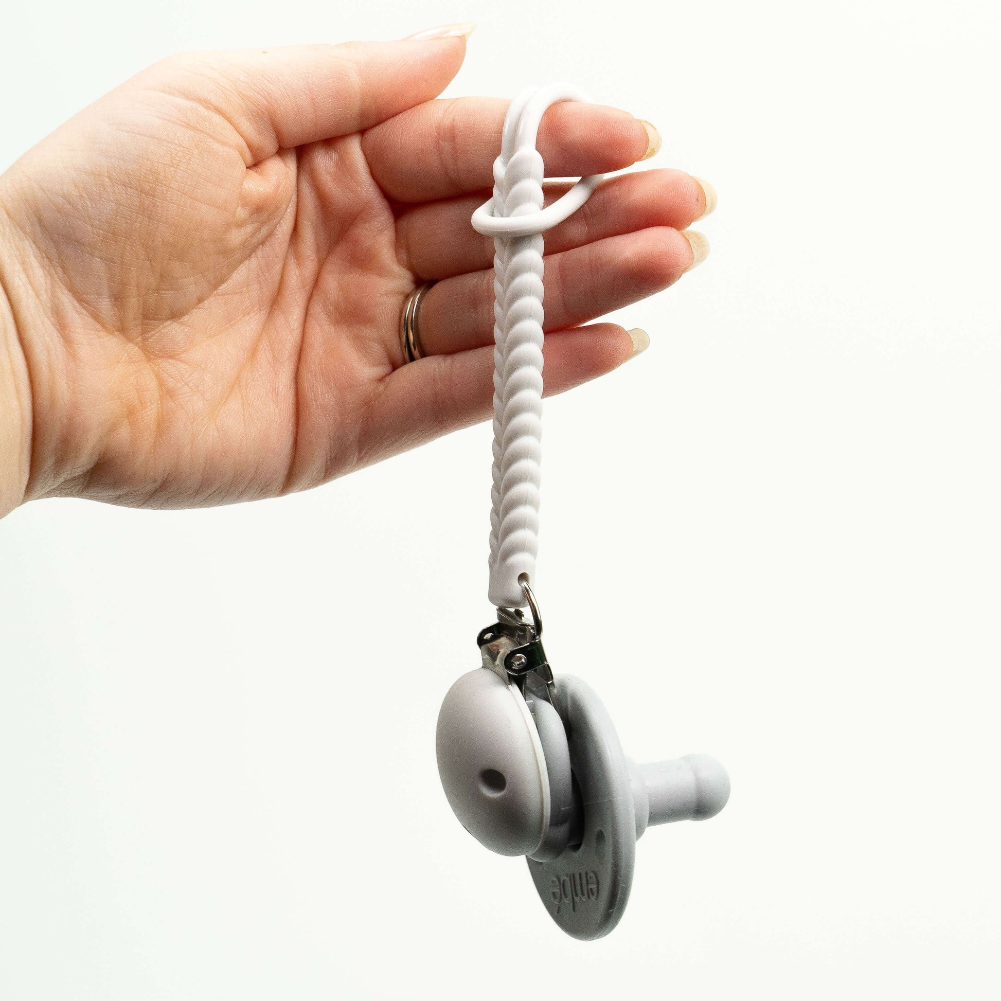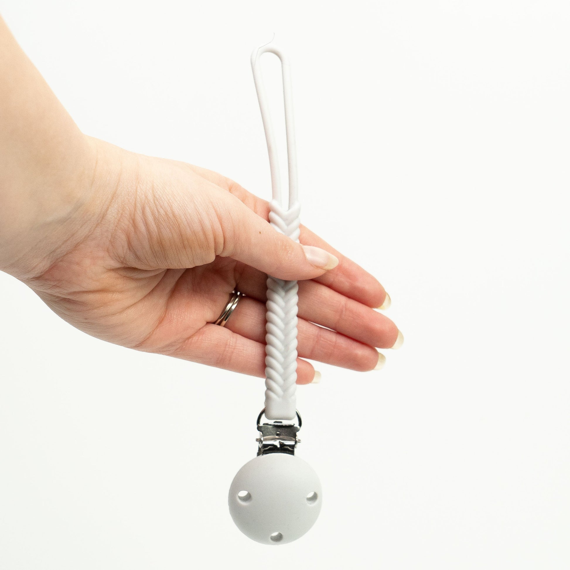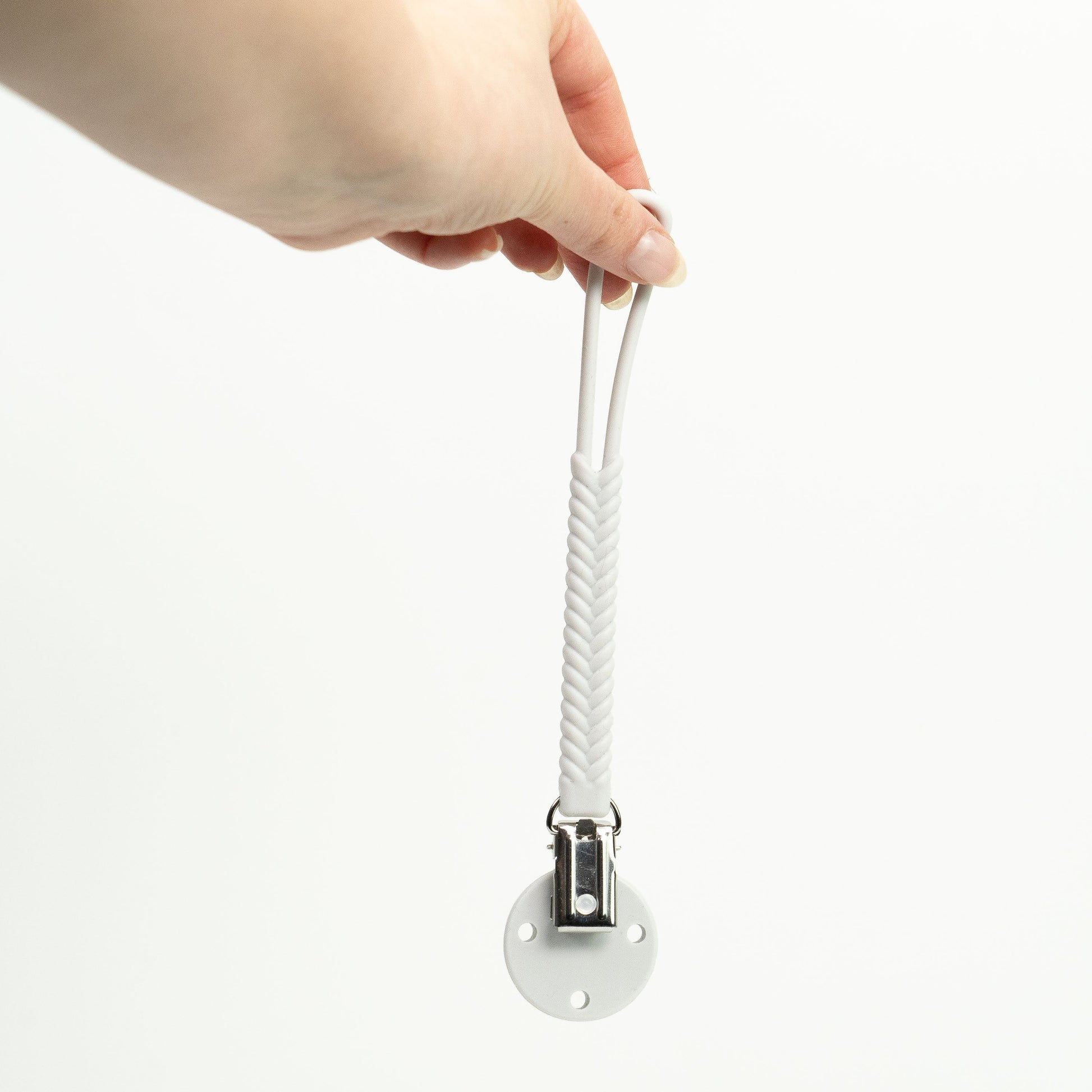 Our hygienic silicone pacifier clip with stylish braided pattern is functional, easy to wipe and clean.