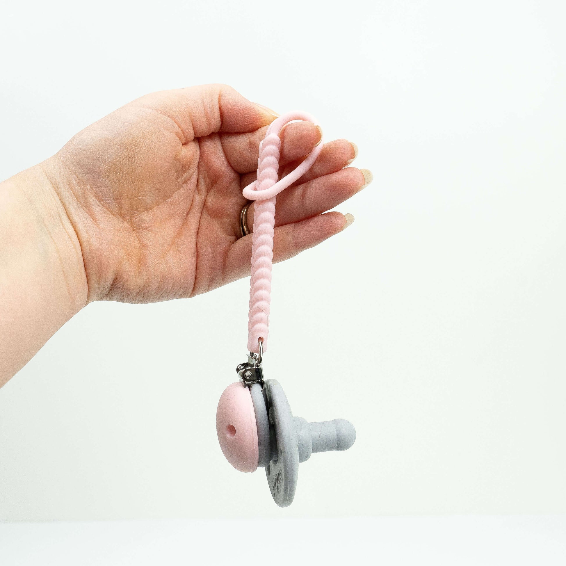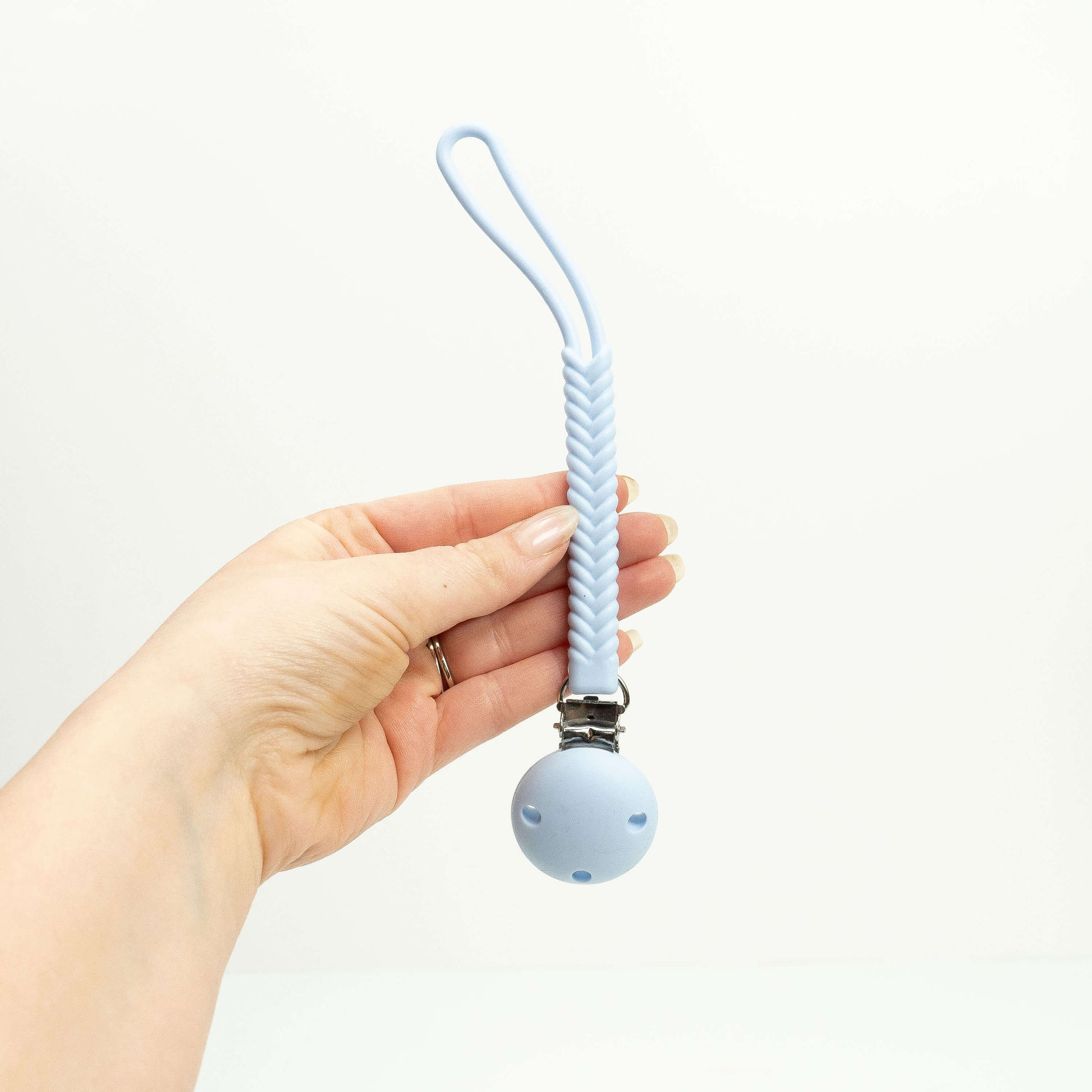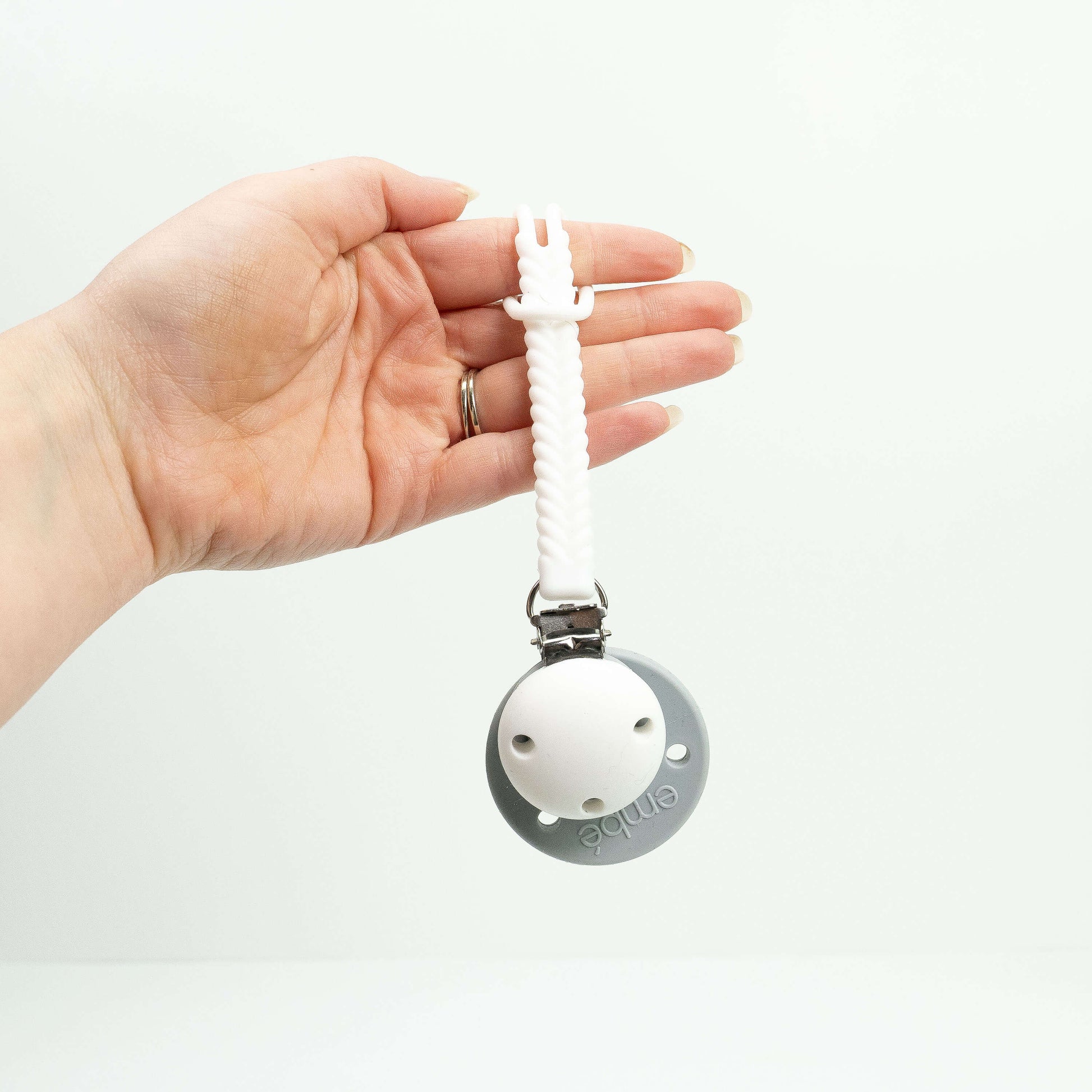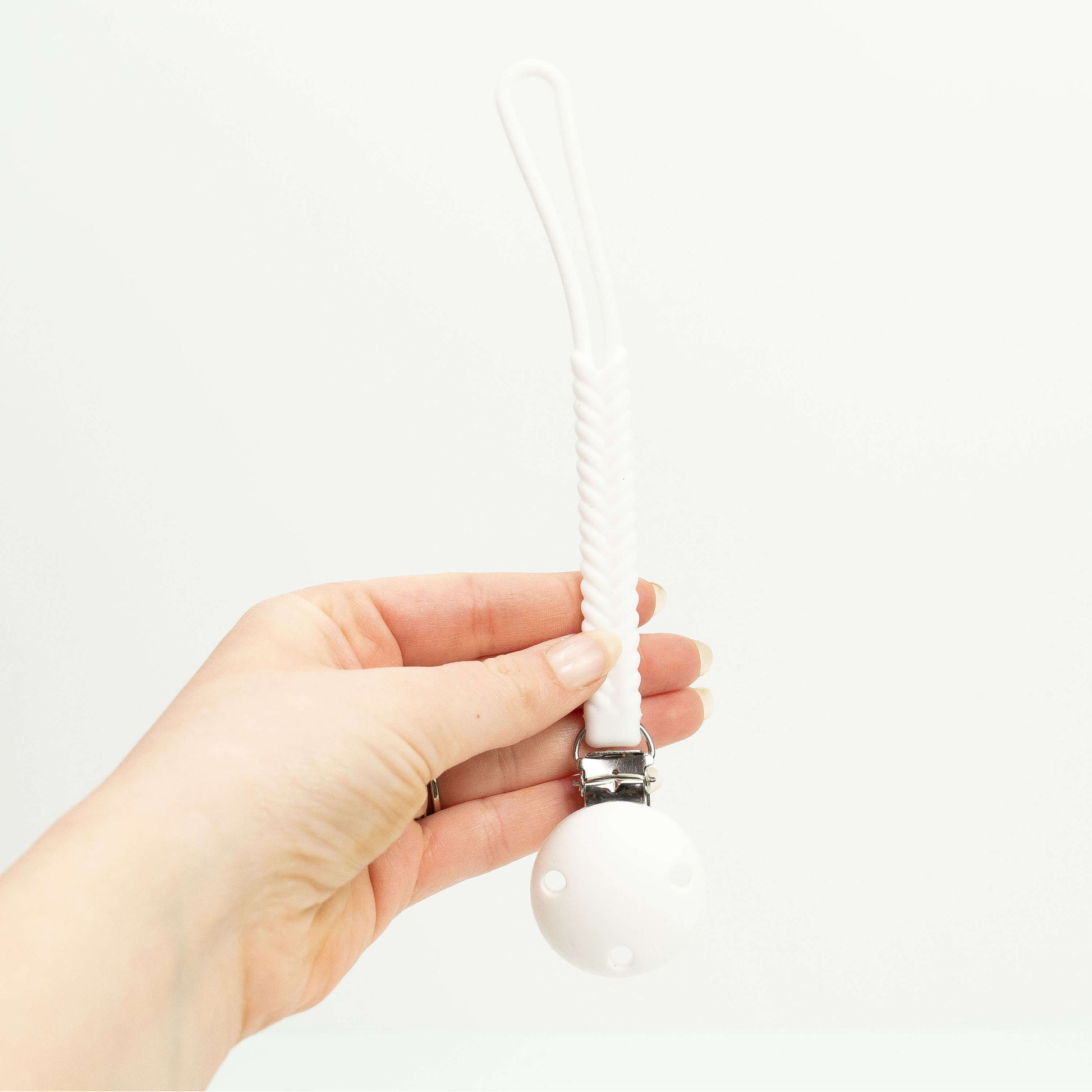 Our hygienic silicone pacifier clip with stylish braided pattern is functional, easy to wipe and clean.