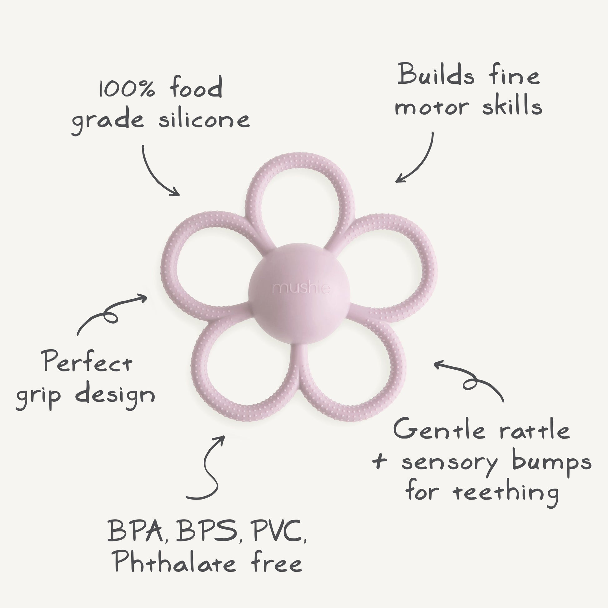 Inspired by nature and designed with functionality and comfort in mind, our silicone Daisy Rattle Teether features a playful flower shape and built-in rattle. The cheerful sound engages baby’s auditory senses for added soothing relief. With handles that are easy for small hands to grasp and a textured silicone surface that massages gums, our rattle teethers are perfect for your little one’s teething journey. Made from 100% non-toxic, BPA free, food-grade silicone.