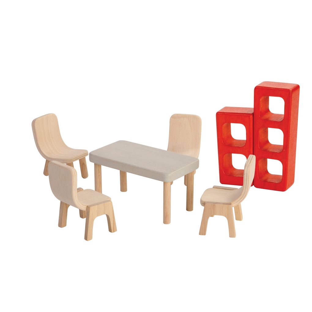 The Dining Room set consists of a dining table, 4 chairs ,and 2 cupboards. This set is compatible with the PlanToys® dollhouses.