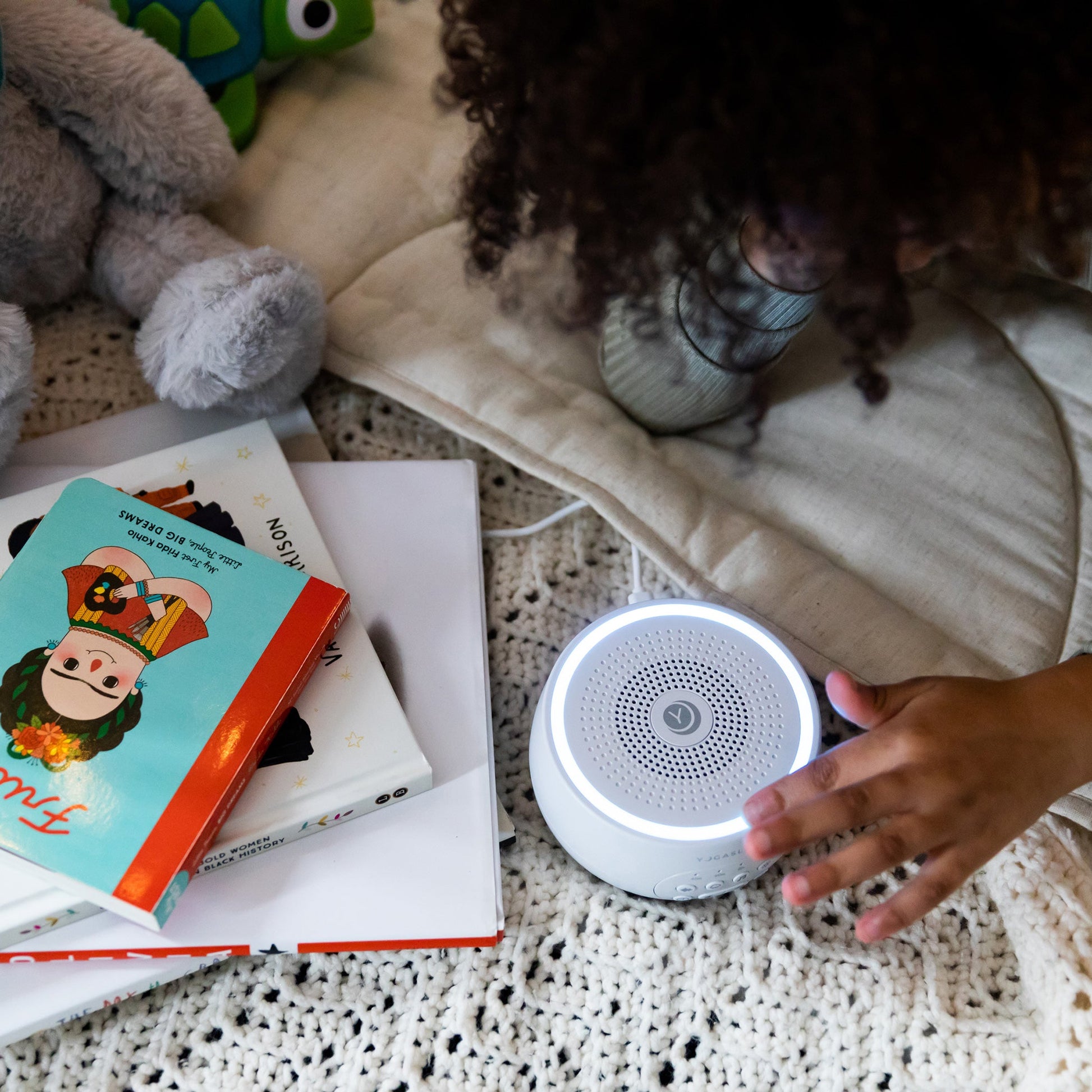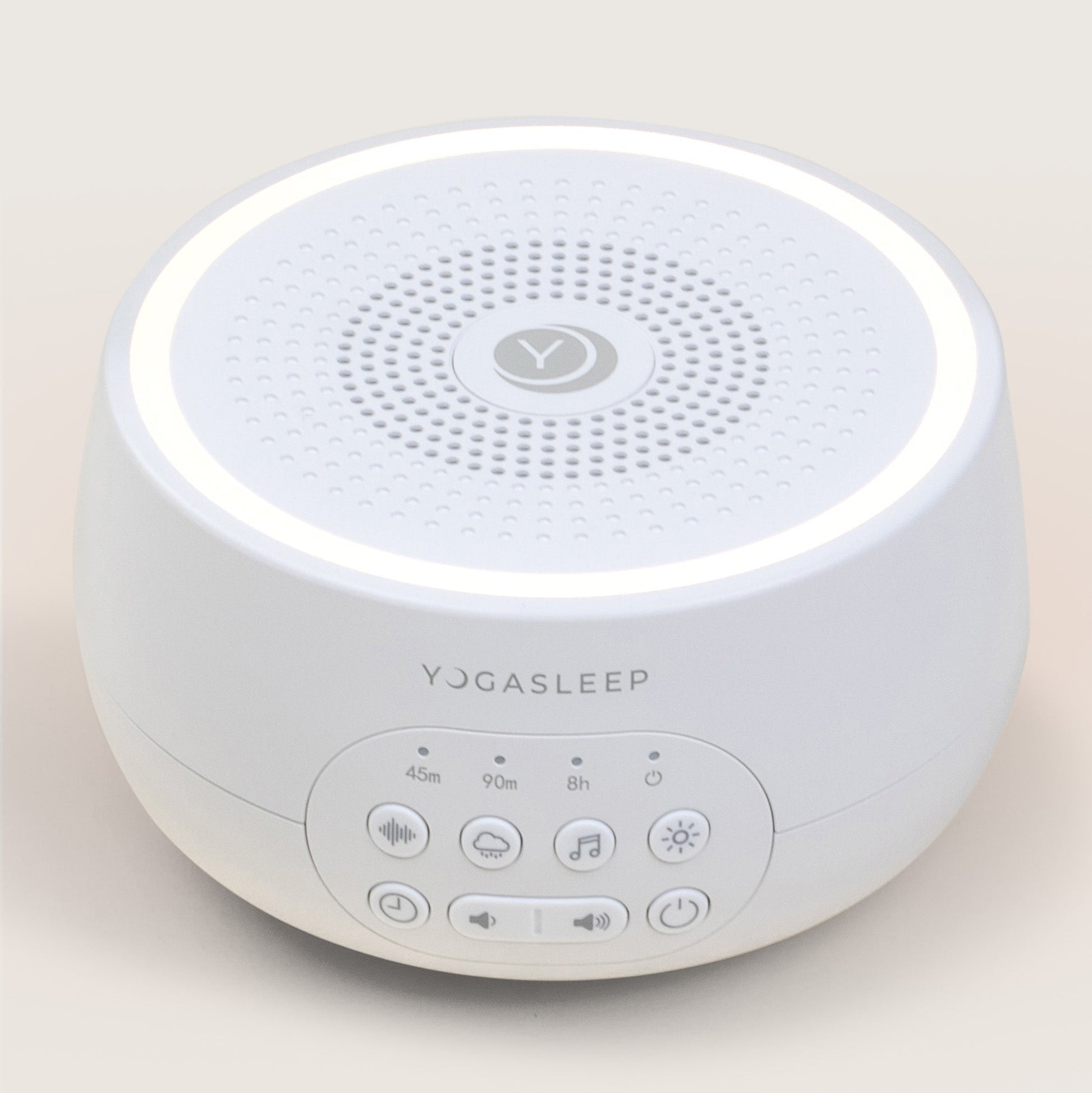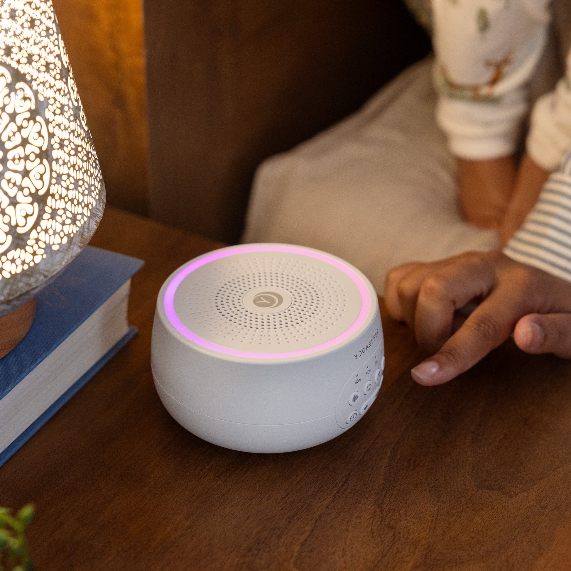 A compact multi-sound machine with a customizable night light to create a calming sleep environment.