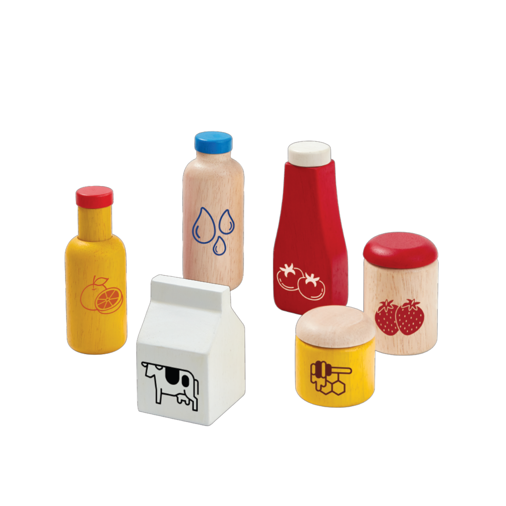- Set includes a bottle of orange juice, a bottle of water, a carton of milk, a bottle of ketchup, a jar of jam, and a cup of honey.