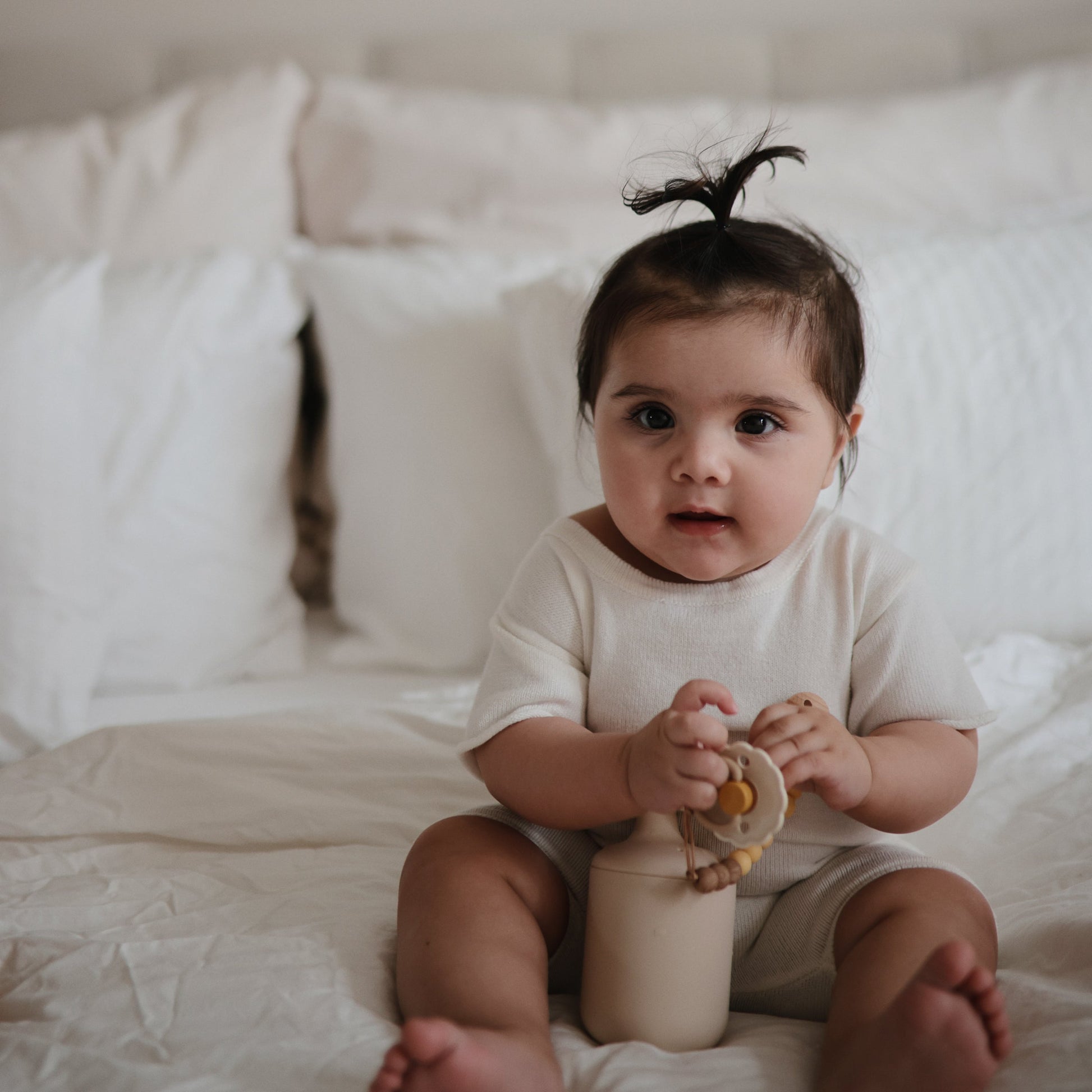 The FRIGG line of natural rubber pacifiers have been thoughtfully designed for your baby's comfort. The outward curve keeps the pacifier off their delicate skin, while features like air holes and a security handle ensure your baby stays safe. Available in a range of soft colors, FRIGG pacifiers make a beautiful addition to your collection of baby essentials.