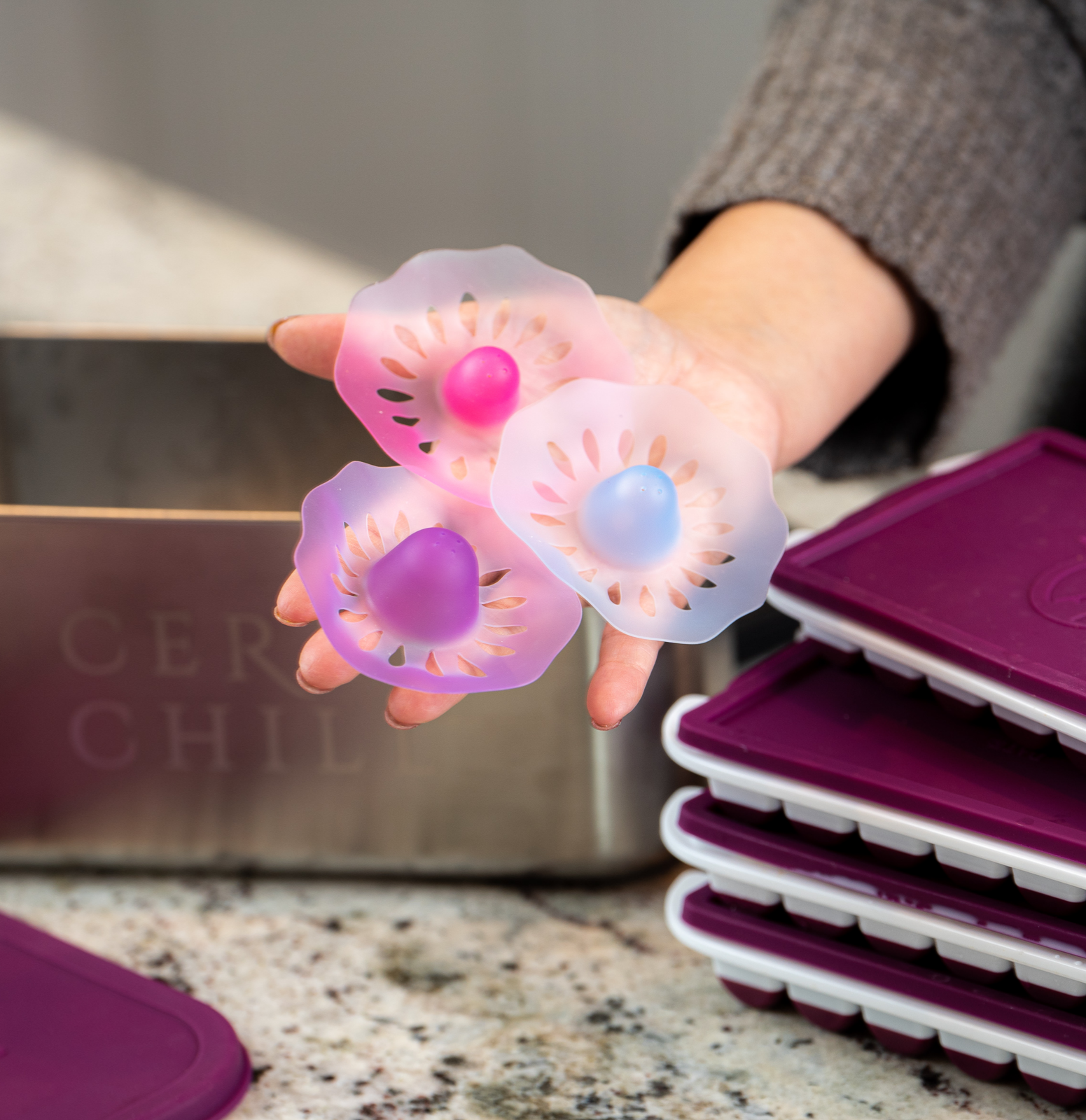 Shield Maidens are colorless when at body temperature so they don't interfere with a more natural breastfeeding experience, and to help you easily find them when they're not in use, the Shield Maidens become a highly-visible color when at room temperature. How cool is that?!