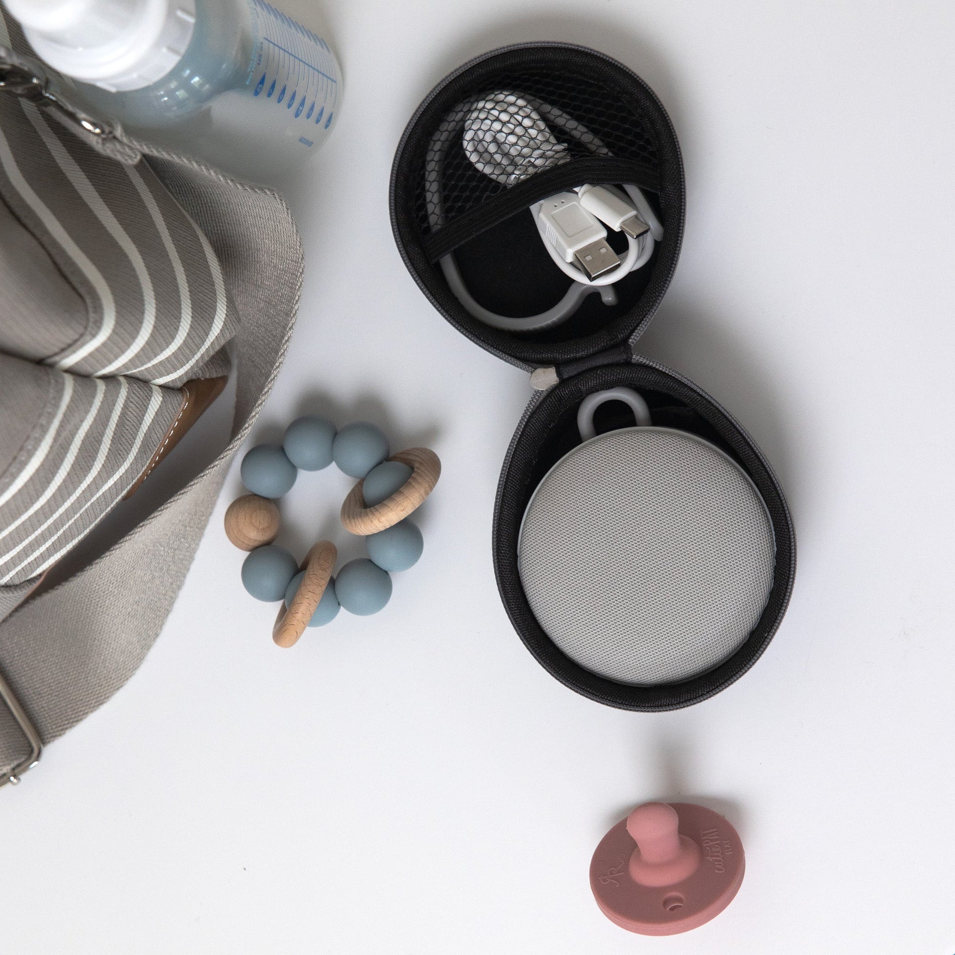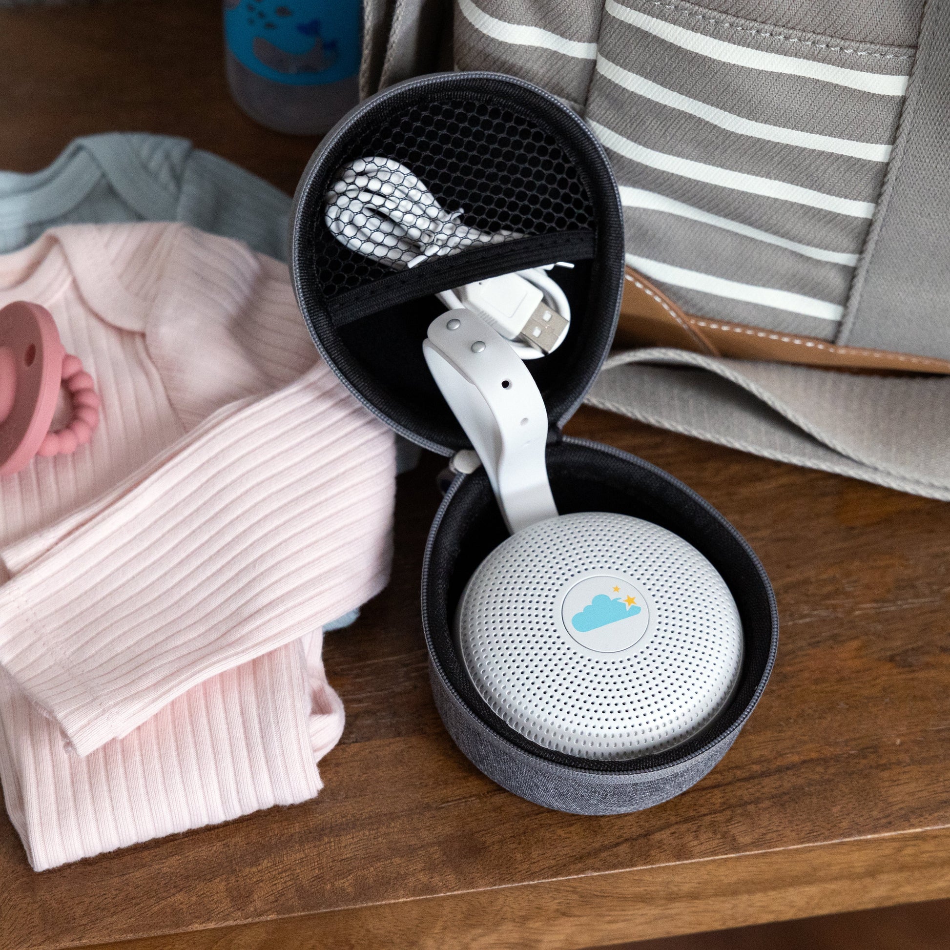 A compact travel case that keeps your portable sound machine protected and organized.