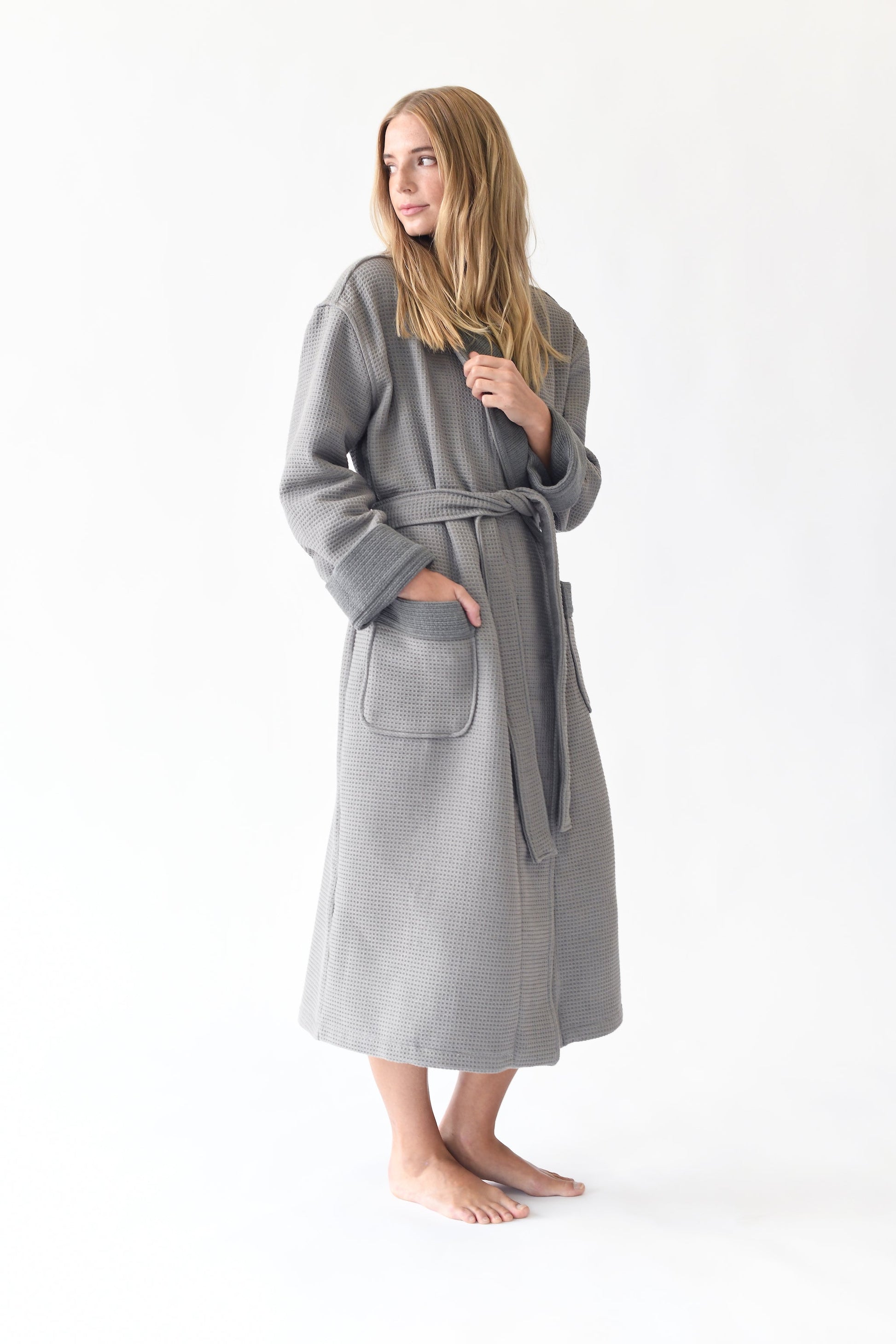 Wrap yourself in spa-like luxury with our Waffle Bath Robe. Featuring dual-sided texture, the ultra-absorbent outer waffle weave is balanced out by the inner softness of ribbed terry. With an adjustable tie waist and large front-facing pockets for extra storage, this robe is soon to be your new favorite part of getting ready.