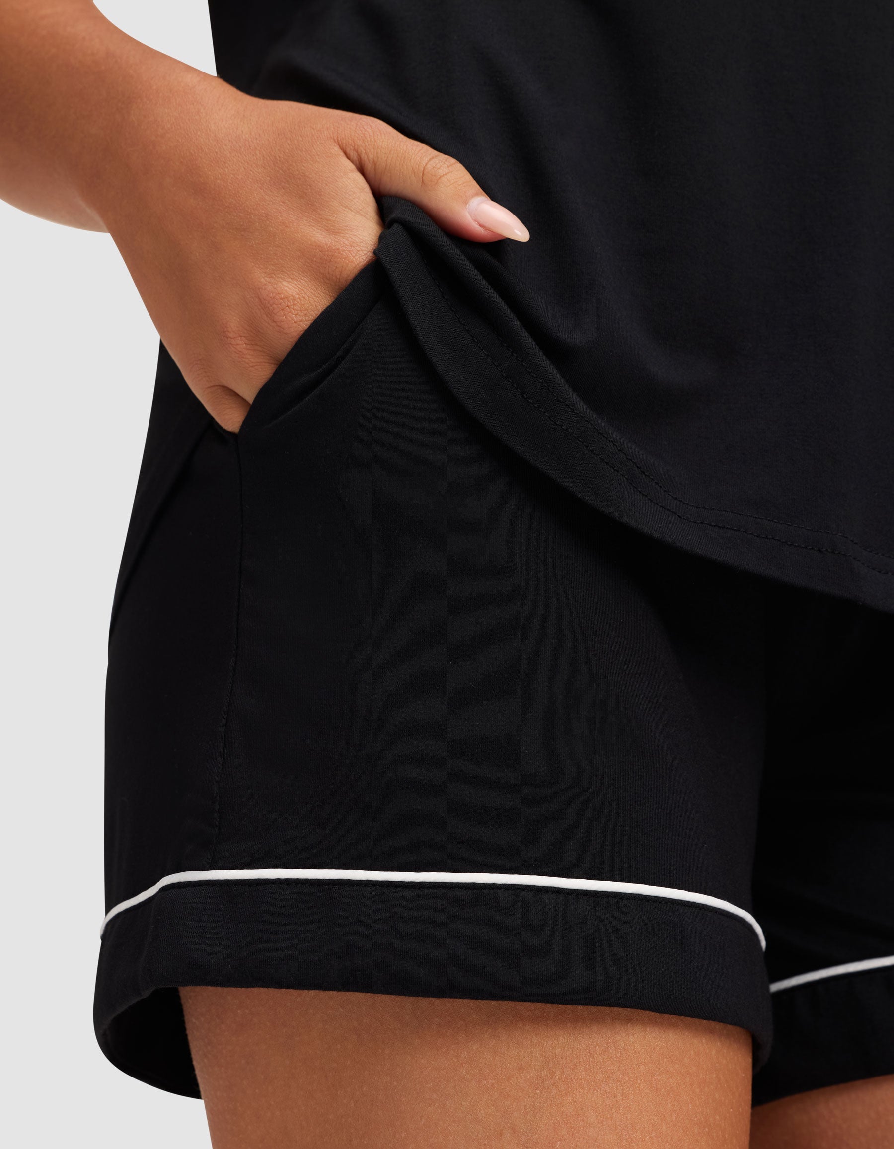 Bedtime can’t come soon enough when you’re waiting to slip into the soon-to-be star of your sleep routine, our Women’s Stretch-Knit Short Sleeve Pajama Set. Made from breathable, stretch-knit fabric, it prevents night sweats and offers a drapey silhouette that resists bunching. With elegant contrast piping throughout, the set includes a pocketed button-up and pants with an elastic waistband.