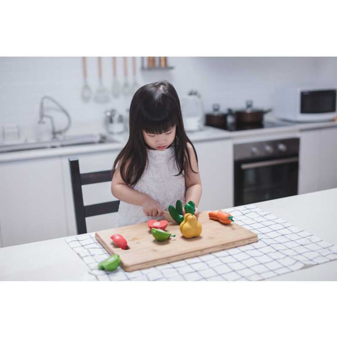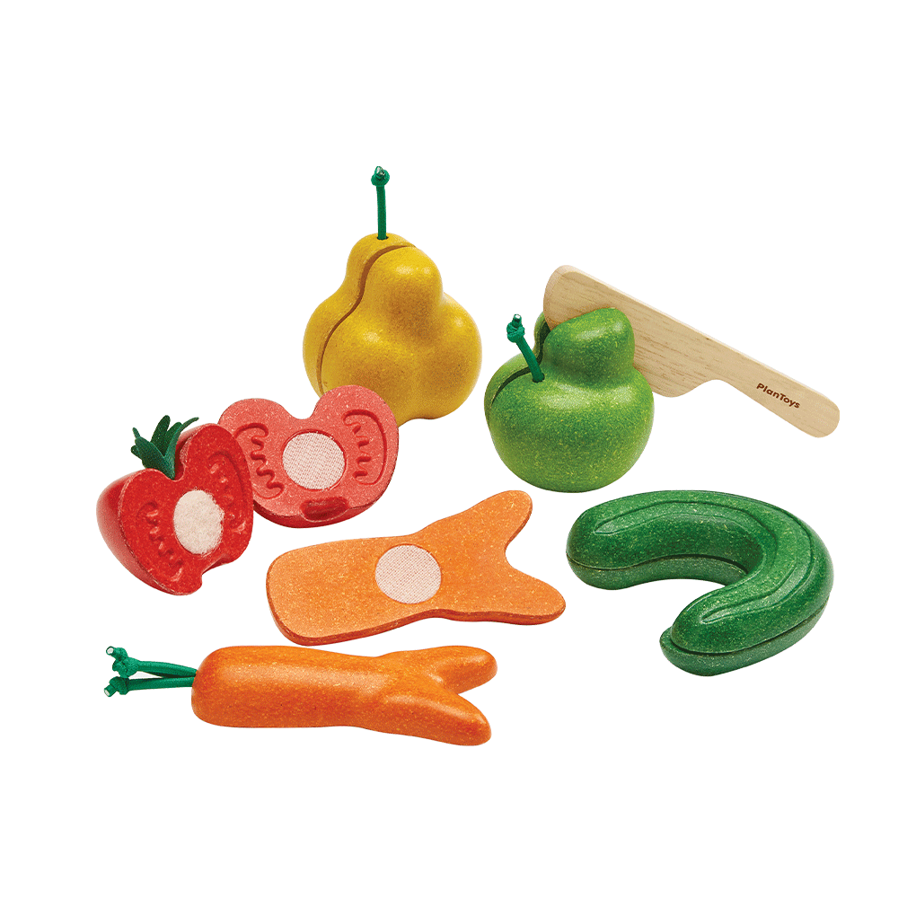 - This set includes a pretend play knife and 5 sliceable fruits and vegetables.
