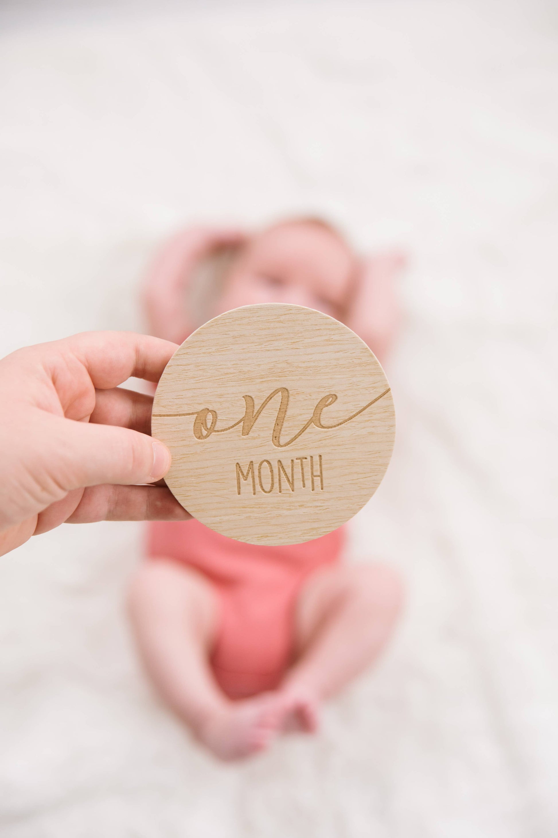 ・Document your baby girl or baby boy’s growth throughout pregnancy and baby’s first year with these gender-neutral baby monthly milestone photo sharing prop cards ・Includes 7 double sided wooden prop cards labeled “one month” through “twelve months”, “hello world” and “oh baby” ・